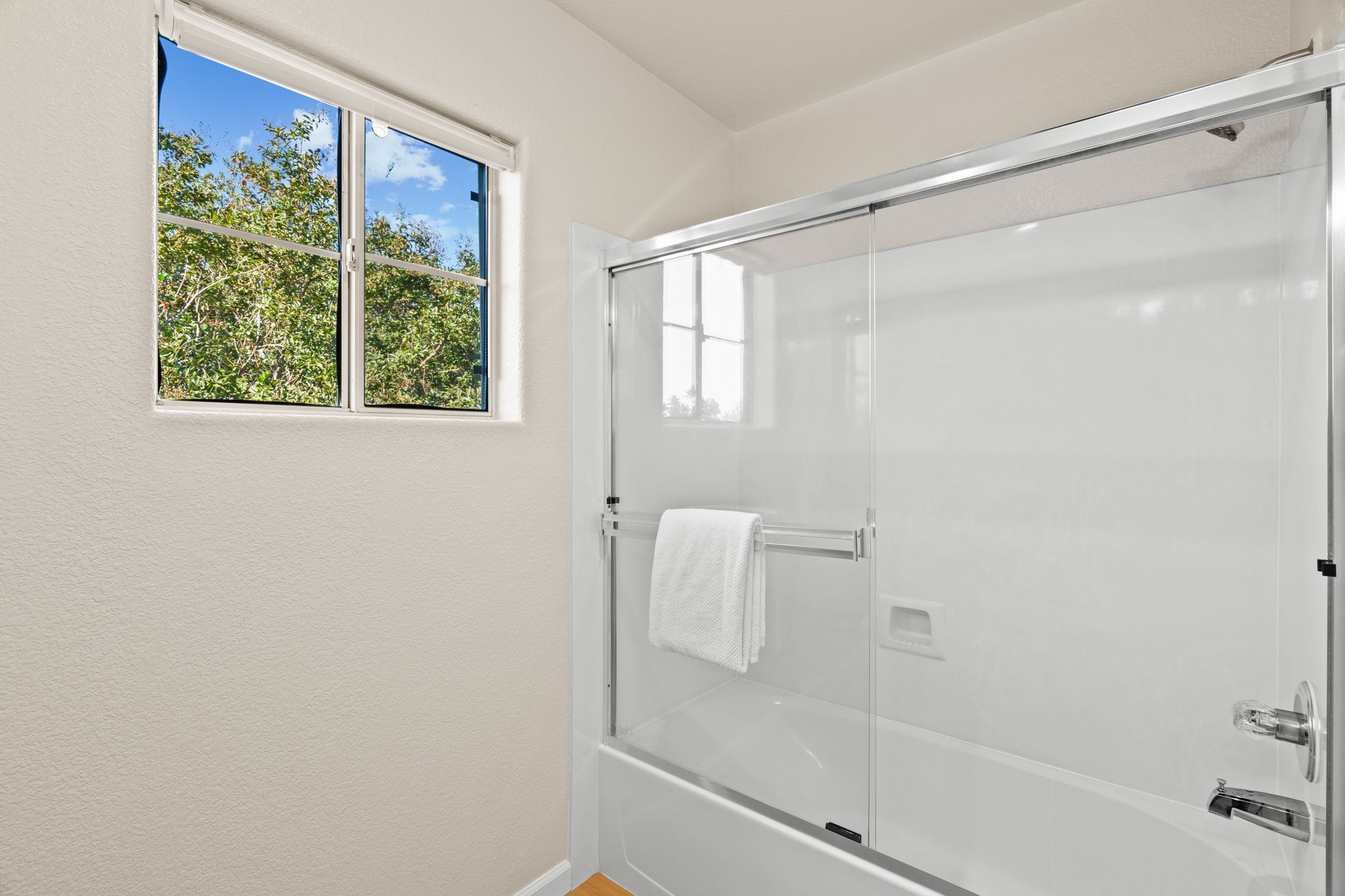 Enjoy indoor-outdoor living with multiple gathering rooms, a large secure patio, and no neighbors directly in front. The kitchen showcases quartz countertops, custom Shaker cabinetry, modern full backsplash, and stainless appliances, including a gas range with griddle. Soaring ceilings cover a primary suite fitted with dual vanities and an oversized walk-in closet.