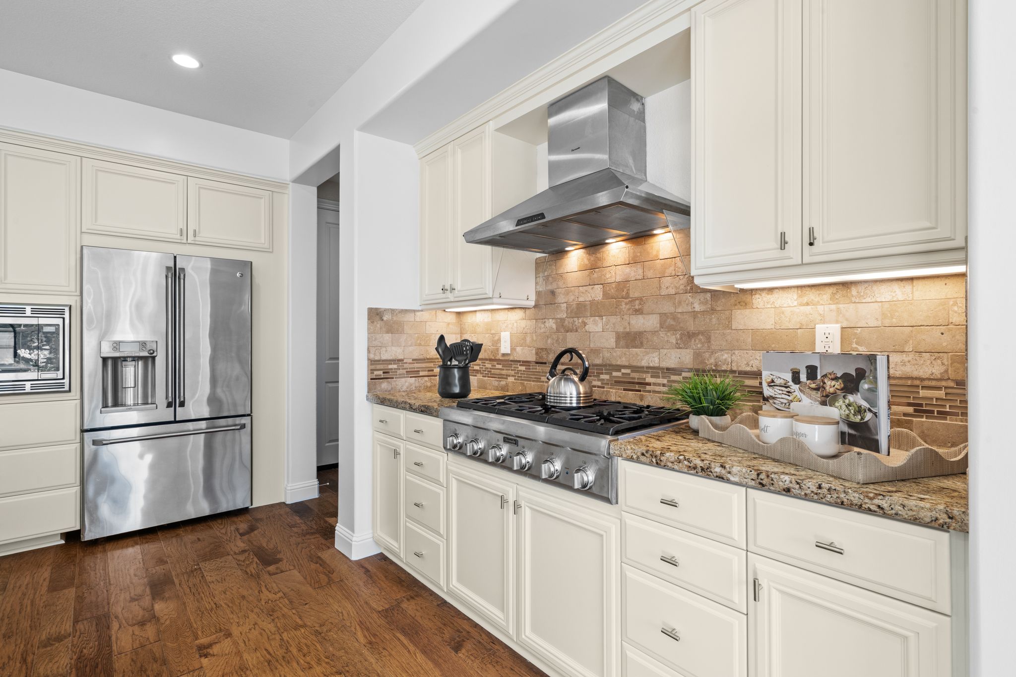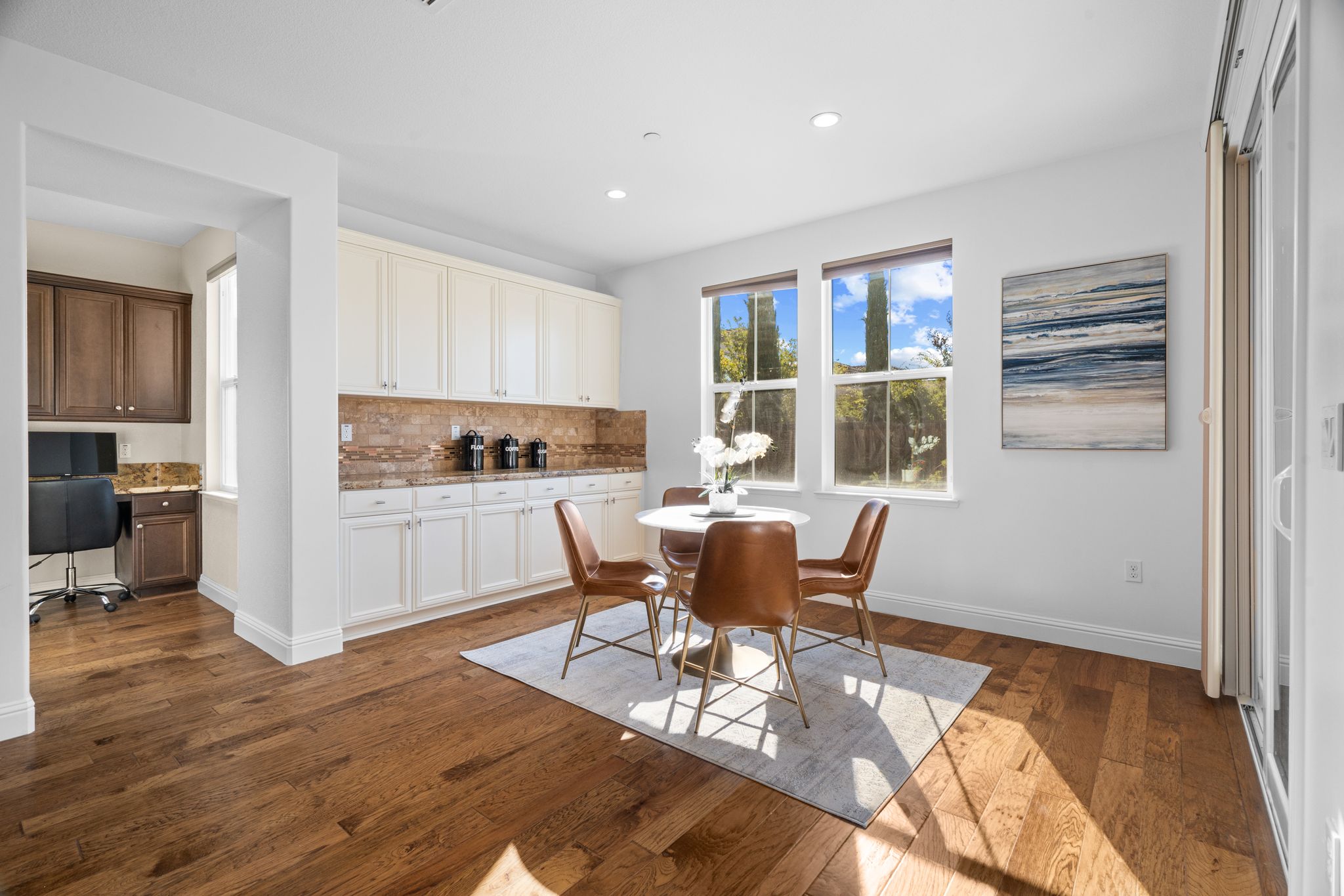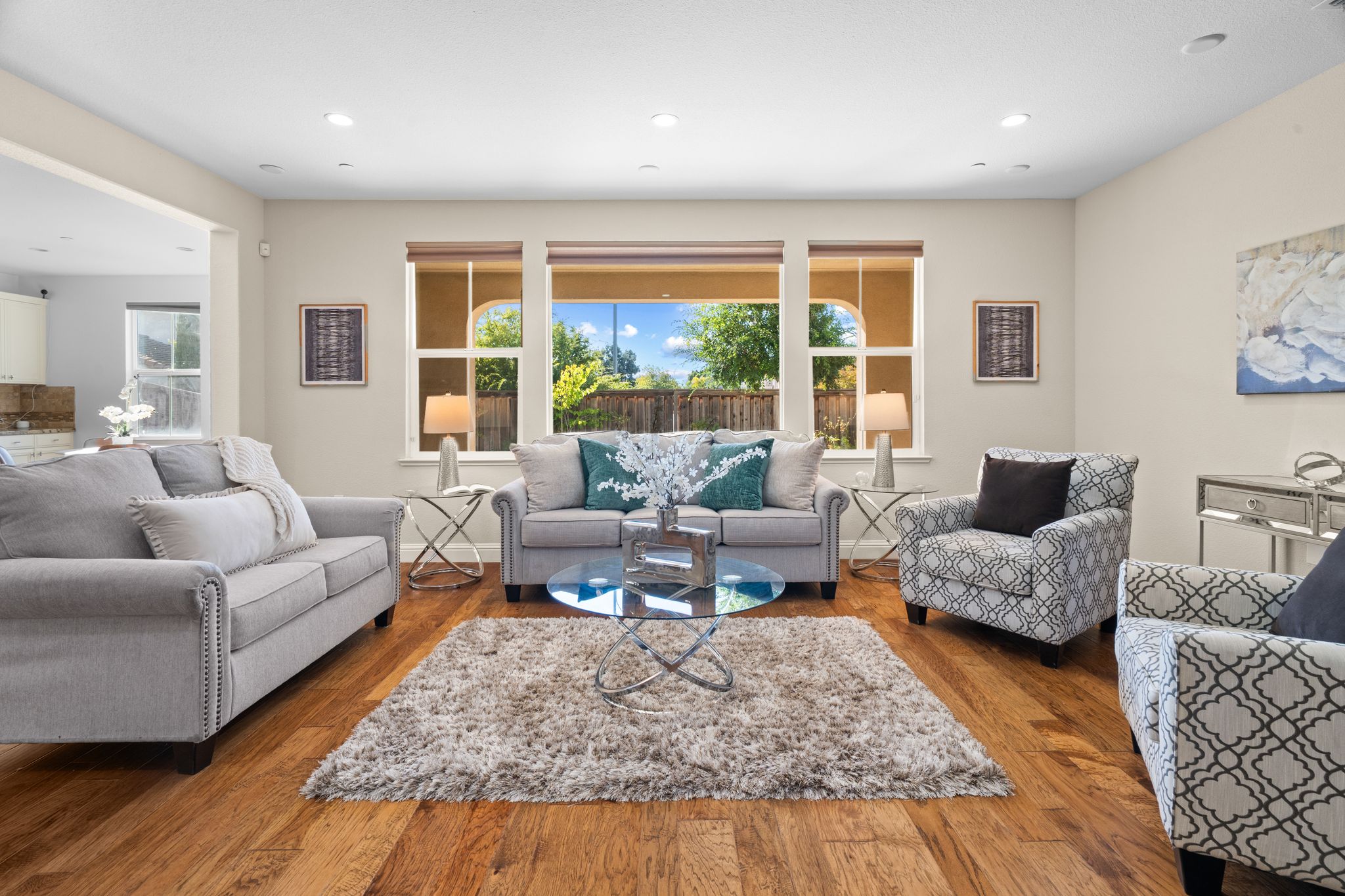Includes a three-car garage with EV charging, dual-sided fireplace, custom Graber® shades, approx. $70K of upgraded wood floors, upper laundry, home office, and versatile media/playroom. Minutes from parks, golf, shopping, commuter routes, and more!